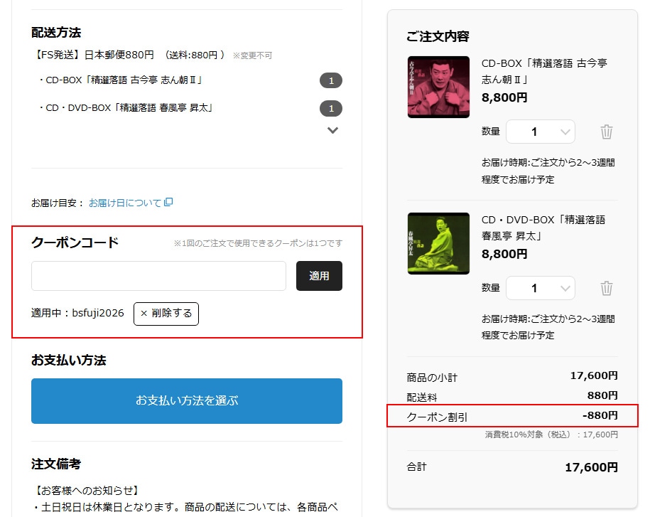 ご購入の際にクーポンコードを入力していただくと、自動的に送料無料割引が適用されます。是非この機会にお買い物をお楽しみください。